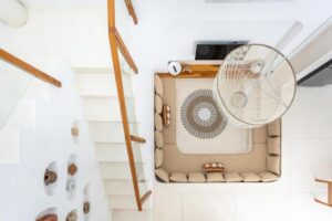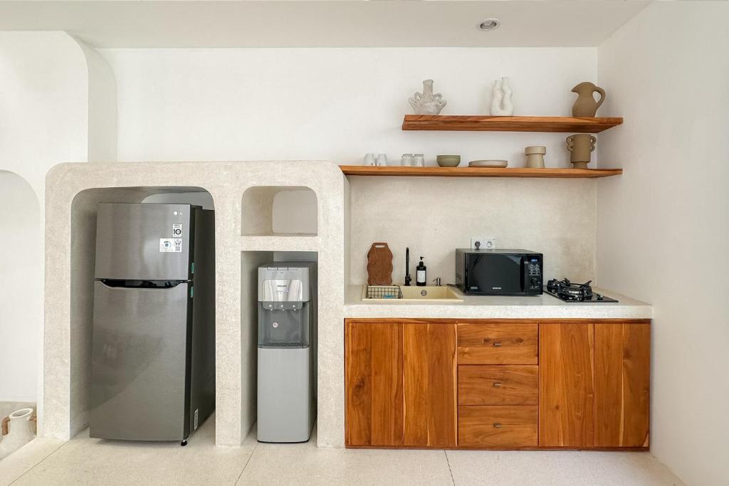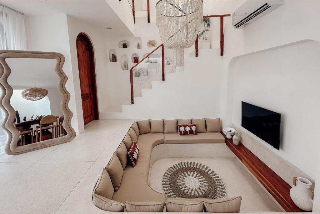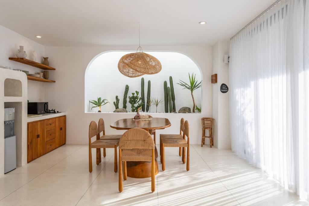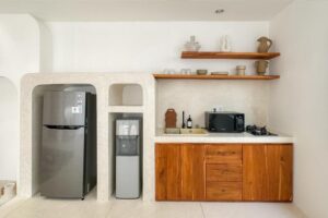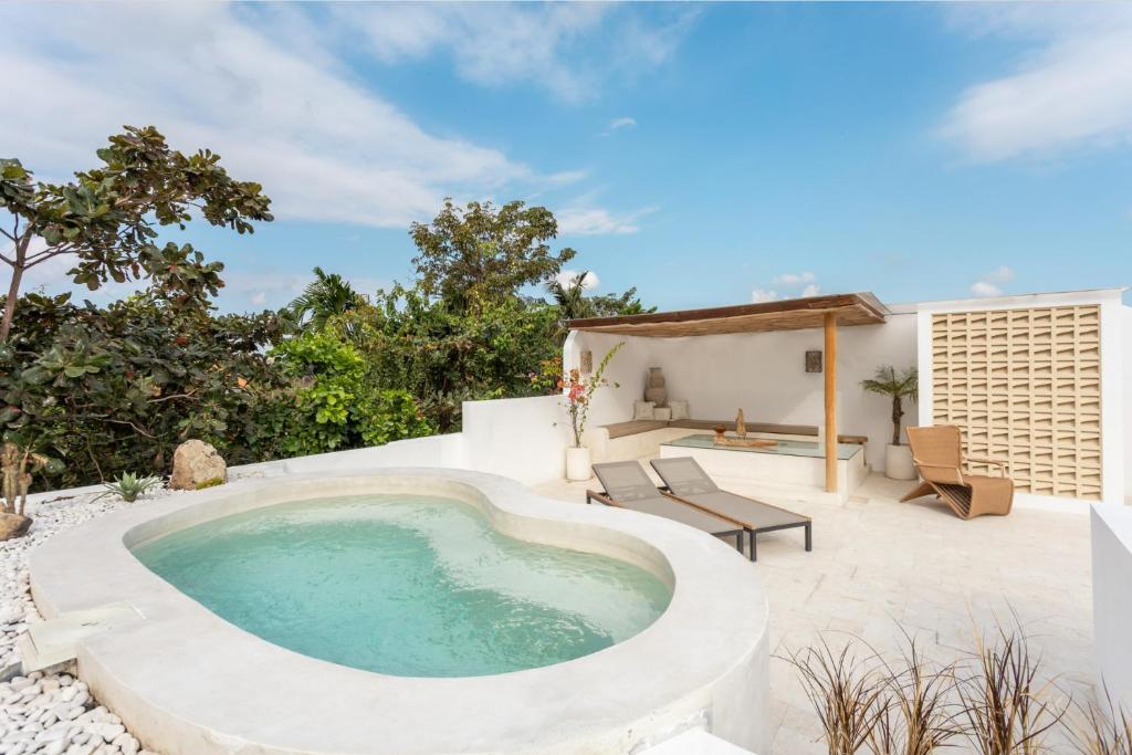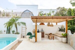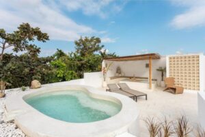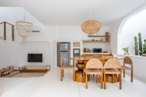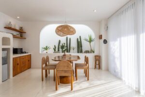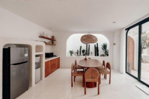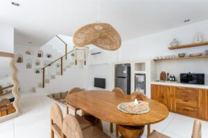 The villa includes a sunken air-conditioned living area, fully equipped kitchen, elegant dining space, and bright open interiors with warm natural finishes. Outside, guests can unwind in the private swimming pool or relax on the rooftop terrace, perfect for sunset views and laid-back evenings.